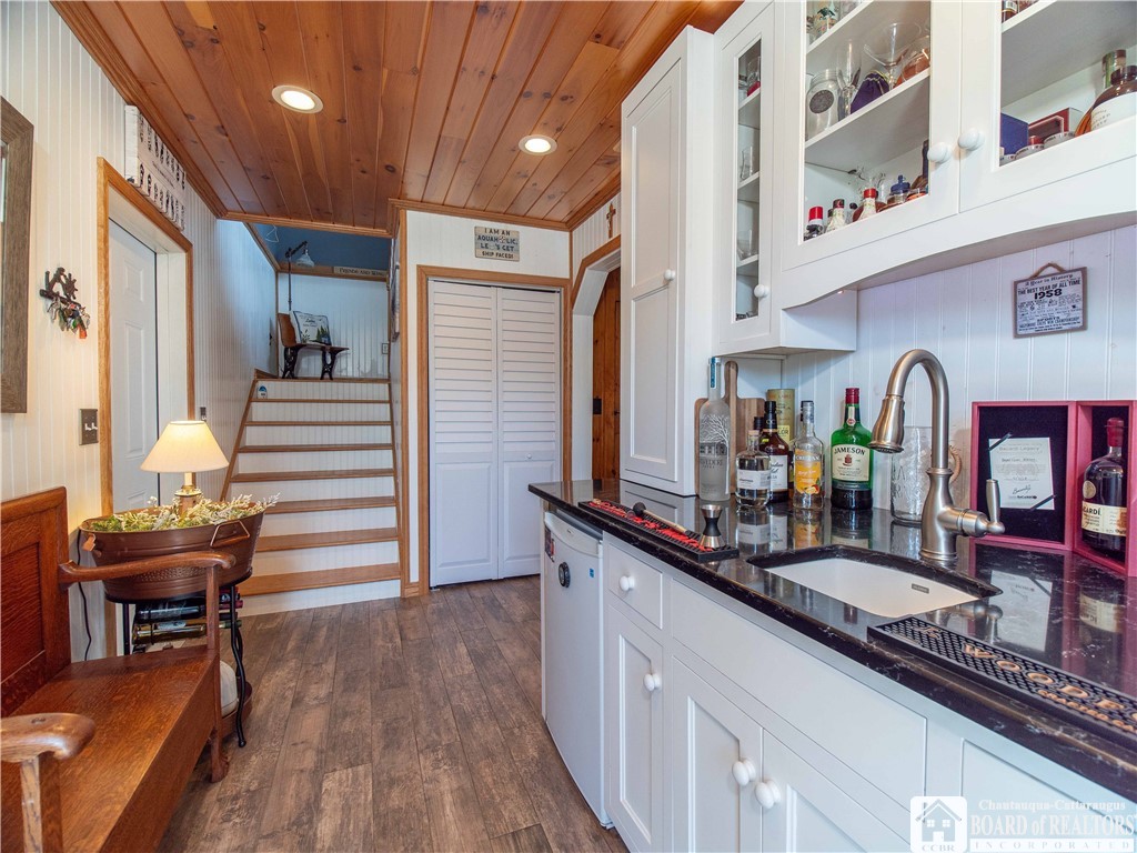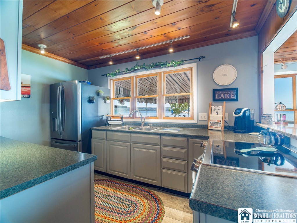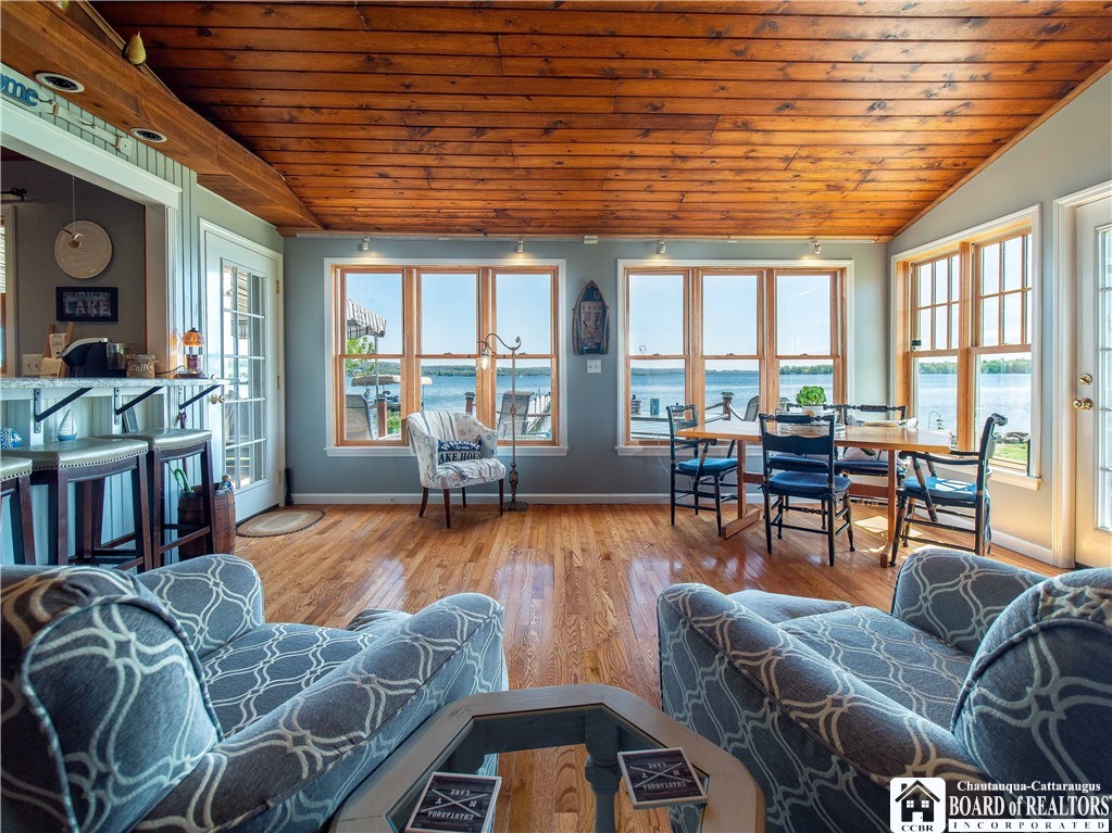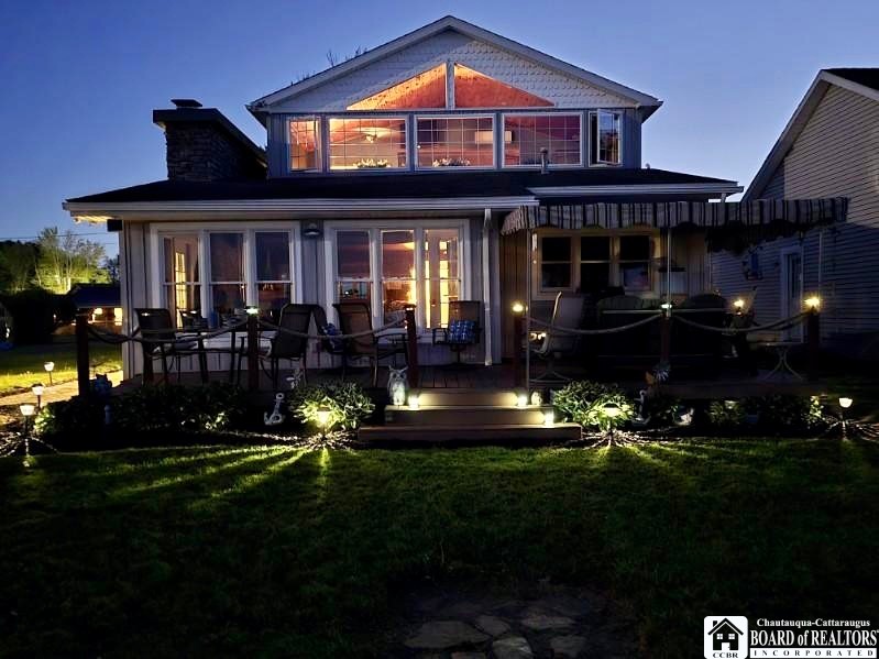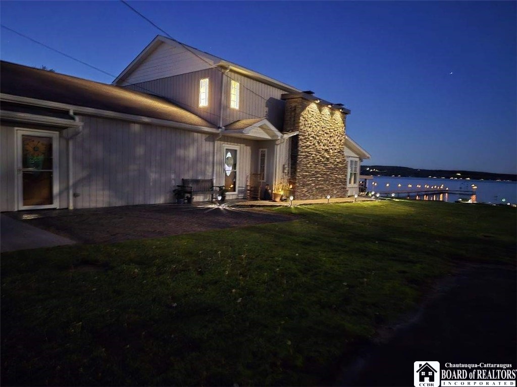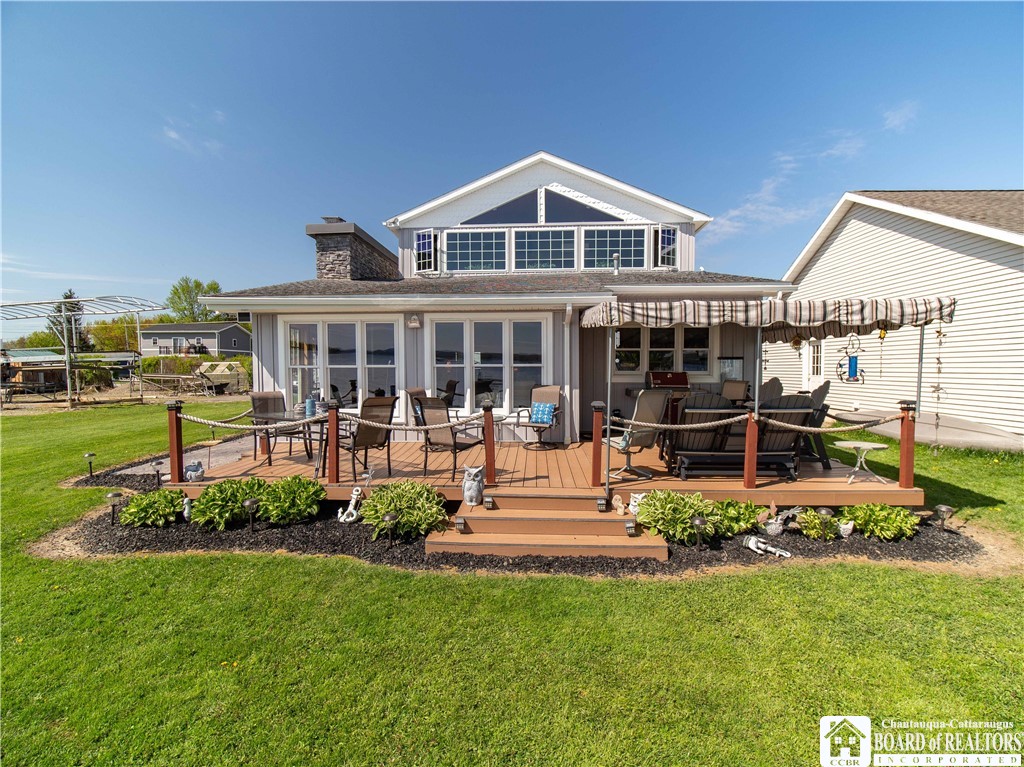 Discover the allure of lakeside living in this stunning 2bedroom, 2-bathroom lake house, where elegance meets comfort in a picturesque setting. Situated along the serene shores of Chautauqua Lake (40'x105'), this maintenance free gem offers a perfect blend of luxury and leisure, making it an ideal retreat for relaxation and recreation. Step into a welcoming foyer complete with a stylish wet bar, setting the stage for entertaining guests or enjoying a quiet evening at home. The spacious open concept living area is adorned w/two beautiful gas fireplaces, providing warmth and ambiance while offering uninterrupted views of the glistening lake. Your personal sanctuary awaits in the expansive primary bedroom suite, which boasts breathtaking lake view, and a generous walk-in closet. Enjoy the convenience of an attached 2car garage, concrete driveway, and stamped concrete sidewalk leading out to your partially covered (awning) back deck. Located within walking distance to the park, and a short drive to all amenities (restaurants, shops, marinas, Chautauqua Institution, Bemus Point & much more). This exquisite lake house is a true sanctuary, offering a harmonious blend of luxury and natural beauty. Whether you seek a year-round residence or a weekend getaway, this home promises an unparalleled lifestyle by the water.