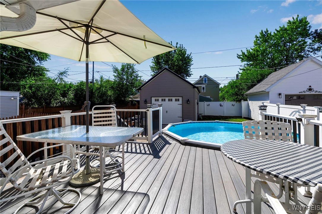 New to the market in North Buffalo, this 3-bedroom bungalow is conveniently located down the street from the North Park Theatre. This home retains its classic Buffalo character with beautiful leaded glass windows and original woodwork throughout. You'll love the screened-in front porch a perfect covered space to relax. The backyard is a true highlight, featuring a low maintenance deck with direct access from the kitchen, an 15 Ft above-ground pool, and Arctic spa hot tub. It overlooks a deep backyard and includes a 1.5-car garage built in 2019, all enclosed by a fully fenced and gated vinyl privacy fence. The dry stone foundation basement offers multiple storage rooms, a newer utility tub, and a 10-year-old boiler. This home truly combines location, charm, and wonderful exterior amenities, making it a must-see! Open House this Sunday, August 24th, from 1-4 PM. Delayed negotiations until Tuesday, August 26th, at 12 PM.