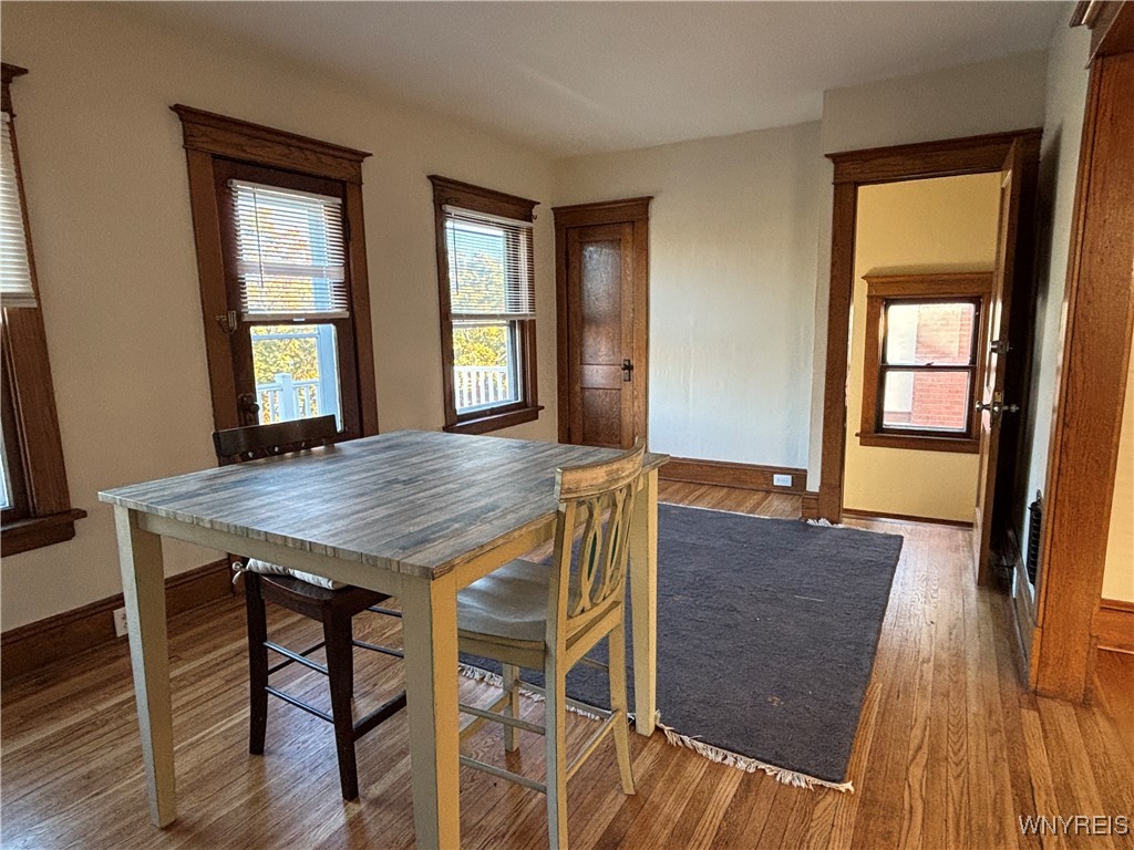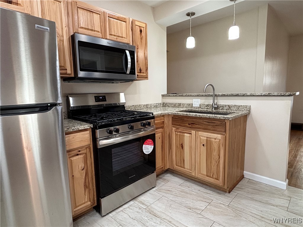 Welcome to this upper rental in the heart of North Buffalo with walking access to Hertel Ave and Delaware Park. The completely renovated kitchen is a chef's dream and lends space for guests to enjoy conversation while you prep on granite countertops and store dishes in the original built-in wall of cabinets. Your new home provides 3 bedrooms, a fully renovated bath with walk-in shower and glass doors, a formal dining room, and living room with decorative fireplace which leads to a large open upper balcony perfect for morning coffee or evening relaxing. The basement offers the use of a utility sink, additional storage, a dryer for tenant use, and laundry hook-ups. A full walk-up attic provides extra space for storage. The upper tenant has full use of the two car garage with automatic opener, and a fully fenced yard with running space for a dog and entertainment for gatherings. Did I mention this upper unit tops off this extensive list with Central Air? One cat and one dog welcome. Tenant is responsible for heat and electric, and snow removal.