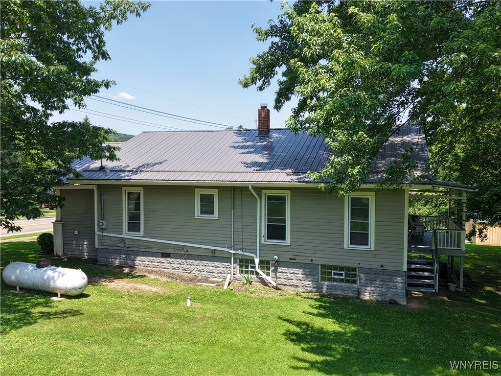 Welcome to this beautifully maintained 3-bedroom, 1-bath bungalow situated on a spacious 0.59-acre lot in the Pine Valley School District. From the moment you step inside, you’ll be greeted by a warm and inviting open floor plan featuring hardwood floors throughout. The updated kitchen is a complete with cabinetry installed in 2020 and plenty of counter space. The convenience of first-floor laundry adds to the home's practicality and ease of living. A durable metal roof was installed in 2021, offering peace of mind for years to come. Enjoy cozy evenings or morning coffee on the covered back porch overlooking the serene backyard. The walk-out basement provides additional space for storage, hobbies, or potential finishing. Heating is provided by a propane-fired boiler system, and the home includes hookups for a portable generator—keeping you comfortable in any season. Other highlights include a 1-car attached garage, municipal water and sewer connections, and the charm of a quiet setting with modern updates throughout. Don’t miss your chance to own this delightful home with the perfect blend of comfort, style, and functionality!