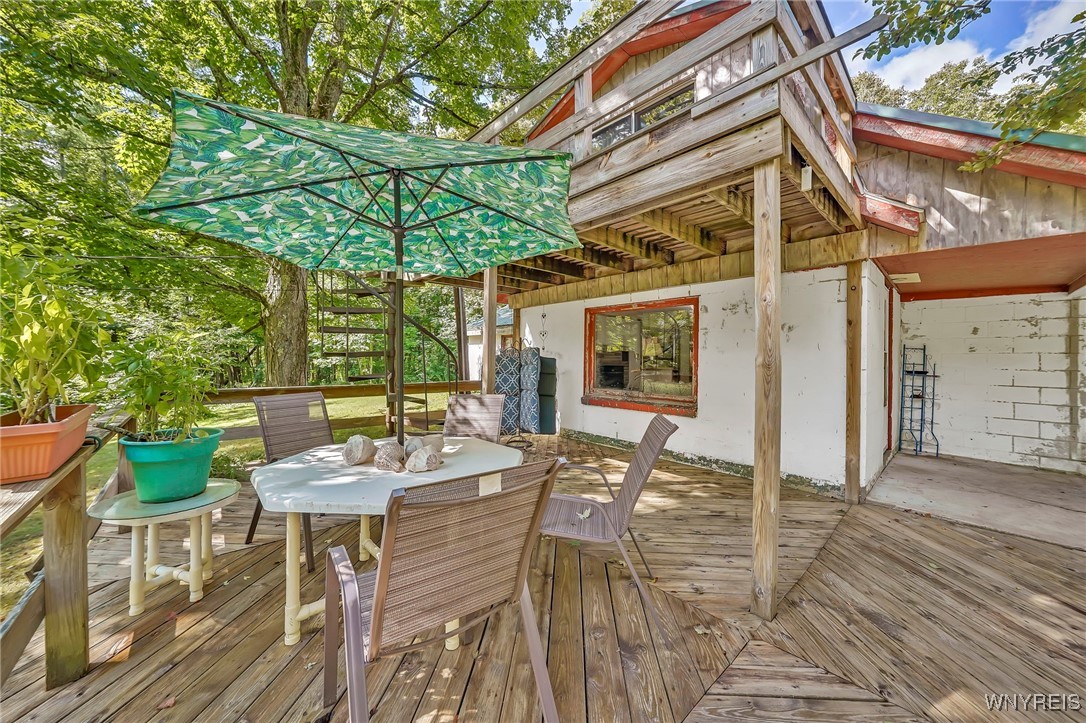 9425 Peck Hill: Here is your opportunity to own a private secluded get away on 4 beautiful acres with over 600 ft of Rd frontage. Currently used seasonally, this 2 bedroom block built home, is set back surrounded by nature allowing you to escape the outside world. A large 2 story deck with spiral staircase offers a great place to overlook this private retreat. Enter into a formal living room with pellet burning stove, the first floor also finds a master bedroom, full bathroom, fully functional kitchen and good sized family room surrounded with windows almost as if you are sitting amongst the trees. A separate laundry /utility room with separate outside Access. Upstairs could be separated into two additional rooms, a sliding glass door also gives access to the second story of the deck. 4 car detached garage. Metal roof 2020. Home and garage will need some TLC but is a GREAT foundation to create your own piece of paradise. Please do not drive into the property without a scheduled appointment, sellers and their dogs are currently at the property. Negotiations begin 9/9/25.